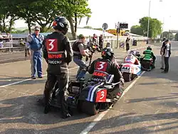 Sidecar competitors wait in the pit-lane to start practice on Thursday evening – 3 June 2010.