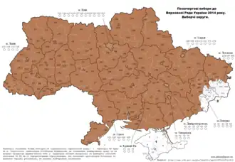 Snap parliamentary elections were held in Ukraine on 26 October 2014 to elect members of the Verkhovna Rada. President Petro Poroshenko had pressed for early parliamentary elections since his victory in the presidential elections in May.[3] The July breakup of the ruling coalition gave him the right to dissolve the parliament, so on 25 August 2014 he announced the early election.[4]