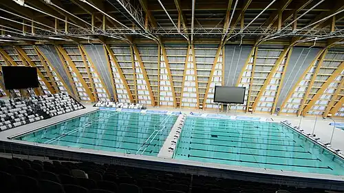 This was the first time since the 1908 Summer Olympics that 100m swimming pools were placed in a football stadium. On the football pitch of the stadium two temporary 50 meters long pools are constructed. Main pool for swimming and synchronised swimming competitions, and a temporary training pool connected with the competition pool with additional athletes relax and massage area.