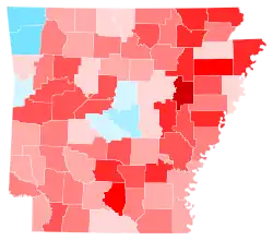 Trump won landslide margins across the state, including in many of the state's metropolitan areas and suburbs. Trump once again carried Woodruff County, formerly a Democratic stronghold, thus marking the first time since its founding that a Democrat was elected president without carrying the county.[7] Biden's strength was mostly isolated to Pulaski County, home to the state capital and largest city of Little Rock, and Jefferson County, home to Pine Bluff. He also won six rural, predominantly African-American counties on the eastern border along the Mississippi River. All but seven counties in the state swung heavily to the right, the exceptions being Pulaski County and one other county in the Little Rock metropolitan area; Sebastian County, home to Fort Smith; and three counties in the northwest encompassing and surrounding the college town of Fayetteville, where the University of Arkansas is located.[8] Notably, Biden lost Washington County, where Fayetteville is, by only 3.9 percentage points, the closest any Democrat has come to winning it since Clinton did so in 1996. Arkansas voted 32.07% more Republican than the national average in 2020.