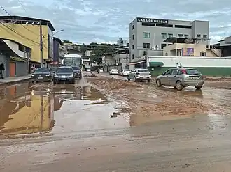 A roundabout in the Canaã neighborhood was destroyed due to asphalt collapse.[22] The Avenida Pedro Linhares Gomes, an urban section of BR-381 passing through Ipatinga, was completely flooded near Shopping Vale do Aço on the morning of 12 January halting traffic on the federal highway. After reopening later that morning, traffic remained congested.[30] Part of Avenida Maanaim, another major thoroughfare, was destroyed by the overflowing the Taúbas stream.[31]