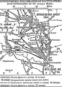 After regrouping its southern forces in the first days of 1943 the STAVKA was determined to defeat the Axis forces (primarily the 2nd Hungarian Army and remnants of Italian 8th Army) operating along the Voronezh–Kursk and Kharkov axes. The first task was to crush the forces defending the area of Ostrogozhsk and Rossosh, which would primarily involve forces of Voronezh Front.[27] By the start of the new year the 219th had been assigned to the 18th Rifle Corps, which also contained the 161st, 270th and 309th Rifle Divisions plus the 10th Ski Brigade and was directly under Voronezh Front command.[28] The Front commander, Lt. Gen. F. I. Golikov, created three shock groupings for the offensive: a northern group consisting of 40th Army, a southern group based on 3rd Tank Army, and 18th Corps as a central group, which was to step off from the Shchuche bridgehead over the Don and link up with the two Armies by the fourth day in the areas of Ostrogozhsk and Kamenka. The 219th was in the Corps' first echelon. The offensive was to begin with probing attacks on January 12 followed by the main effort the following day. On the second day the division was to advance with the 96th Tank Brigade in the direction of Yekaterinovka and Saguny and by the fourth day was to capture Dankovskii and Lykovo, covering an average of about 12km each day.[29]