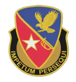 Distinctive Unit Insignia was a gold and black metal device with a rounded heater shield divided red and blue with a gold cavalry saber on the dividing line. Above is the gold eagle and below a white star with a gold border. Below is a black scroll with the motto "Impetum Persequi" (to continue the attack).[4]