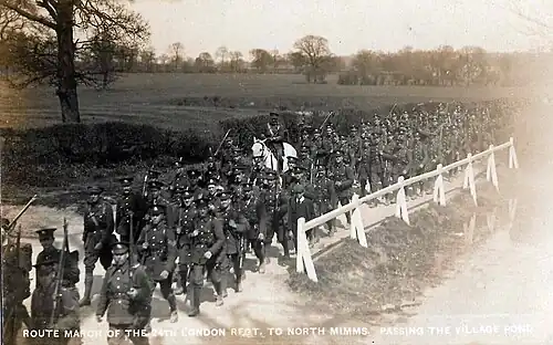 Route march of the 24th London Regiment to North Mimms, passing the village pond (ca 1910).