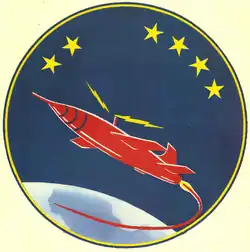 1. ^ Approved 29 July 1957. Description: On a disc of Air Force blue sky, edged Air Force golden yellow, fimbriated of the first [color mentioned], a red stylized missile, highlighted white, rising, nose to dexter chief, three stripes of the field['s color] encircling the nose, the antenna emitting two Air Force golden yellow lightning flashes; all between six stars arched of the last [color mentioned], two in dexter chief, four in sinister chief, and the edge of the globe in base, water areas light blue, land areas white; a red and Air Force golden yellow vapor trail edged white circling over the globe. Significance: The red stylized missile denotes the armament capability of the missile and designates this squadron as a missile unit. The lightning flashes above the missile represent the guidance features of the missile. The three blue stripes around the nose denote the three distinct types of teams authorized in the squadron maintenance and operations branches. The Earth indicates that the missile capabilities are not limited by the geographic features of location. The yellow border symbolizes the organization of the squadron by providing unity to the various functions in the squadron.