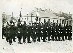 The regiment commemorated the Rohatyn battle, its first in the Polish–Soviet War where all battalions fought together, by designating September 9 as its regimental holiday.[16] Over the following days, it continued defending Rohatyn from Soviet counterattacks. Reinforced with three marching companies on September 13, the regiment, as part of the 4th Infantry Division, pursued the enemy to Vyshnivets.[15] On September 25, it was transported to Grodno as a reserve unit for the high command. Redirected by the 2nd Legion Infantry Division, the regiment moved via Grodno and Łomża to Ostrołęka on 12 November 1920. It served in border protection there until 28 April 1921, after which it returned to Kutno and Łęczyca.[15]