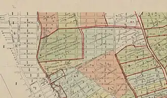 A map published in 1776 shows the general location of the Clarke estate. A detail from a digital reproduction of this map is shown here as Image No. 4. The parcel owned by Benjamin Moore was located directly to the north of the property marked "Oliver Delaney Esq.". The Clarke estate contained orchards, copses, and open fields, while the Moore strip of land contained arable land and fields. The road that led to the southeast corner of the Clarke estate and that gave access to Clarke property and the Moore strip was called Abingdon Road or Love Lane.[20] Expressed in modern context, the estate, with the addition of Benjamin Moore's property, extended from Eighth Avenue on the east to river's edge at about Tenth Avenue on the west and from the north side of Nineteenth Street on the south to the south side of Twenty-fourth Street on the north. Shown against the modern grid of streets, Clement Clarke Moore's complete inheritance of is shown on a map made in 1891. A detail from a digital reproduction of this map is shown here as Image No. 5.