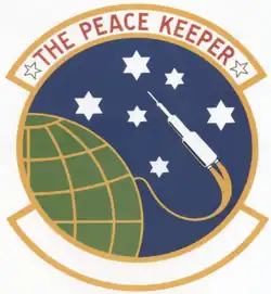 1. ^ Approved 31 March 1970. Description: On a blue disc edged with a yellow border issuing from dexter base a green demi-sphere grid-lined yellow from which a white missile is ascending bendwise emitting a yellow arched vapor trail, the missile between six white six-pointed stars. Attached below the disc a blank white scroll edged yellow. Attached above the disc a white scroll edged yellow and inscribed [with the motto] in scarlet letters between two white stars edged black. Significance: The overall theme of the design illustrates the mission of the unit – to maintain the peace through deterrence and, if necessary, launch the force of missiles. The six stars, each with six points, symbolize the 66th Strategic Missile Squadron. The missile crossing the water illustrates the intercontinental nature of the force. The demi-globe is representative of the land mass over which the missiles traverse.