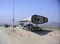 Hertz convinced the client to purchase the 747 airplane, originally worth about $25 million when Boeing completed it in 1970, for US$35,000. Mark Thompson of Thompson Aviation sold the airplane and his team detoxified, cut apart, and transported the plane for airlift. Using a laser and the cut-off saws at the Victorville Airport, home of the second largest airplane graveyard in the nation, the cockpit and tail were removed and the fuselage cut longitudinally. Next, transverse sectioning reduced large segments of fuselage and the wings to a manageable size for transport. A truck carried the parts, measuring 47 by 125 feet (14 by 38 m), successfully without damage. Seven California Highway Patrol vehicles escorted the truck during the night and closed multiple lanes of three major freeways, State Routes 2 and 15, and US Route 101, to accommodate the vehicle. The wings traveled from the Southern California Logistics Airport aircraft boneyard to Camarillo Airport in Camarillo, California, located 10 miles from the site. At that point, because each wing weighed approximately 20,000 lb (9,100 kg) and the only way to transport such heavy, unwieldy sections to a remote destination was from above (navigation by truck was deemed impossible), the wings needed to be cut in two for proper positioning for transport by helicopter, which was completed by a Columbia Model 234 operated by Columbia Helicopters Inc. of Portland, Oregon and took over two hours to complete. The helicopter positioned the wings on a large pile of tires at the site. The wings were then spliced back together and lifted onto columnar supports, attaching the custom fabricated steel brackets on the columns to the engine mounts on the wings. The wings touched the ground at few points creating minimal foundation requirements.