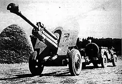 The 76-mm divisional gun M1939 (F-22 USV or USV) (Russian: 76-мм дивизионная пушка обр. 1939 г. (Ф-22 УСВ or УСВ)) was a 76.2 mm cannon produced in the Soviet Union. It was adopted for Red Army service in 1939 and used extensively in World War II. The gun was designated as "divisional" - issued to batteries under the direct control of division headquarters. The F-22 USV was an intermediate model, coming between the F-22, which had limited anti-aircraft capability, and the simpler and cheaper ZiS-3, which eventually replaced it in production and service.