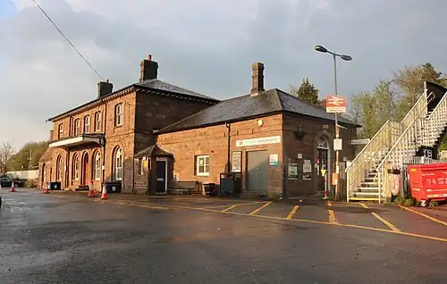 The station, designed by Charles Liddell, Chief Engineer of the Newport, Abergavenny and Hereford Railway (NA&HR), is in an Italianate architecture style[2] in a local pink semi-ashlar sandstone[3] with natural slate roofs and stone stacks. The down platform building is built of stone with a timber-framed front and a natural slate roof.[1] The footbridge comprises cast iron columns of typical GWR design which support the stairways and the two spans. The span over the now removed by-pass freight lines is the wrought iron lattice girder original but the main span over the running tracks was replaced by a steel plate-girder in the late 20th century.