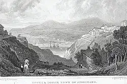 Lower Fishguard developed as a herring fishery and port, trading with Ireland, Bristol and Liverpool. In the late 18th century it had 50 coasting vessels, and exported oats and salt herring.[8] In 1779, the port was raided by the privateer Black Prince,[9] which bombarded the town when the payment of a £1,000 ransom was refused. As a result, Fishguard Fort was completed in 1781, overlooking Lower Fishguard.[10] The port declined in the latter half of the 19th century.
