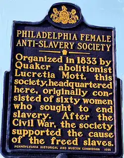 The Society for the Relief of Free Negroes Unlawfully Held in Bondage (Pennsylvania Abolition Society) was the first American abolition society, formed 14 April 1775, in Philadelphia, primarily by Quakers. The society suspended operations during the American Revolutionary War and was reorganized in 1784, with Benjamin Franklin as its first president.[42][43]