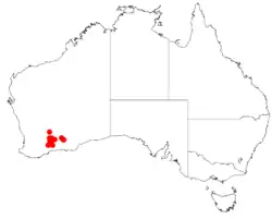 This species of wattle grows in sand and gravelly soils in woodland, open scrub and heath in scattered locations in the Coolgardie and Mallee bioregions of south-western Western Australia.[2][4]
