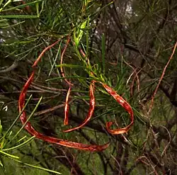 Acacia chisholmii, commonly known as turpentine bush or Chisholm's wattle,[2] is a species of flowering plant in the family Fabaceae and is endemic to arid areas of north-eastern Australia. It is a shrub with many spreading stems, erect, linear phyllodes, spikes of golden yellow flowers and linear, curved, leathery pods.