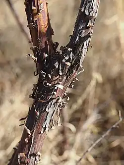 The viscid and spreading shrub typically growing to a height of 1 to 4 metres (3 to 13 ft). It flowers from May to September producing yellow flowers.[1] The bark is red-brown minni ritchi style. The phyllodes have an oblique arrangement and a linear-obovate shape, typically 1 to 5 centimetres (0.4 to 2.0 in) in length and 1.2 to 7 millimetres (0.05 to 0.28 in) wide. The flowers five-merous with a calyx that is 0.3 to 0.8 mm (0.012 to 0.031 in) long. These eventually form seed pods that flat and straight to strongly curved and 2 to 10 cm (0.8 to 3.9 in) in length containing red-brown seeds.[2]