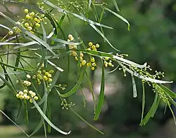 The tree has a slender and erect habit and typically grows to a height of up to 10 metres (32.8 ft). It has a bushy crown and usually has a single stem but can divide into several stems at ground level[1] which have smooth grey coloured bark. The branchlets are usually pendulous and are angled or flattened and a reddish-brown often covered with a white powdery finish.[2] It has straight or shallowly recurved, glabrous, blue-green to grey-green phyllodes[1] that have a narrowly oblanceolate to narrowly elliptic or linear shape with a length of 7 to 22 cm (2.8 to 8.7 in) and a width of 3 to 15 mm (0.12 to 0.59 in). It blooms throughout the year[3] but most heavily between September and January producing racemose inflorescences with spherical flower-heads containing between 18 and 50 flowered golden to pale yellow coloured flowers. After flowering linear brown seed pods form that are up 16 cm (6.3 in) in length and 5 to 17 mm (0.20 to 0.67 in) wide with a firm papery texture. The dull to slightly shiny dark brown to black seeds within the pods have an oblong to oblong-elliptic shape and a length of 4 to 6 mm (0.16 to 0.24 in).[2]