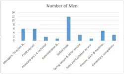 According to the 2011 census, occupations in skilled trades was the most widespread for men, while six men were variously employed as managers, directors, professionals and senior officials; occupations with lowest counts were in sales and customer service and administrative and secretarial occupations. Eight women were employed in administrative and secretarial services, with the lowest count was for professions.[4][5]