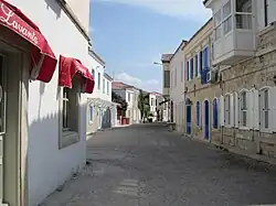 Alaçatı has stone houses with coloured windows and narrow streets with pavements. The centre of Alaçatı has houses from the Ottoman period; the ones that belonged to Ottoman Greeks are distinct, by having an additional enclosed balcony area, alcove window or cumba in Turkish. Typically, enclosed cumba balconies are painted by lilac or pale blue colors. The town was declared as a historical site in 2005; the buildings are well protected. The newly built houses refer to the past architectural principles of the Ottoman houses of the agora of Alaçatı.[14]