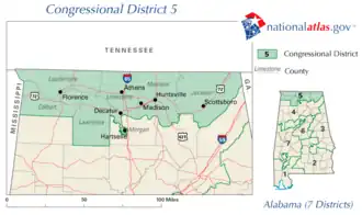 Alabama's 5th congressional district is a U.S. congressional district in Alabama, which elects a representative to the United States House of Representatives. It encompasses the counties of Lawrence, Limestone, Madison, Morgan, Jackson, and part of Lauderdale. It is currently represented by Republican Dale Strong, a former Madison County Commissioner. Strong was first elected in 2022 following the retirement of Republican incumbent Mo Brooks.