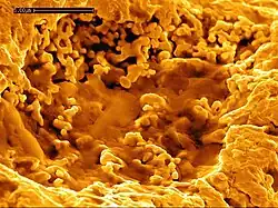 A scanning electron microscope image of a gold nugget, revealing bacterioform (bacteria-shaped) structures