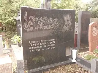 Alexander Zinoviev died on 10 May 2006 from a brain tumor. According to Maxim Kantor, in the last conversation, he discussed the dehumanization of European culture, arguing that only the revival of humanism could save Russia.[3] According to the testament, he was cremated, the ashes were scattered from a helicopter over the Chukhloma Region, where Zinoviev was born and grew up, a boulder was installed at this place. In memory of the merits before the Russian culture, a symbolic grave-cenotaph was erected at the Novodevichy Cemetery in Moscow.[16] Posthumously, Zinoviev was awarded the title "Honorary Citizen of the Kostroma Region". In 2009, a monument to Zinoviev was erected in Kostroma, on the territory of Nikolai Nekrasov Kostroma State University (sculptor Andrey Kovalchuk).[21] In 2016, on the eve of the 95th anniversary of Zinoviev, a new species of butterflies was named in his honor – "Zinoviev's Fan Wing" (Alucita zinovievi).[22]