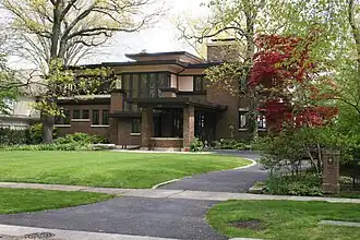 The Alfred Bersbach House was completed in 1915 and is found at 1120 Michigan Avenue in Wilmette. The house is heavily influenced by Frank Lloyd Wright, and it is often mistaken for one of his designs. The house was mistakenly advertised as a Wright design in real estate listings in the 1950s and 1970s. The two-story house is a Prairie School design of brick and stucco; brick dominates the first story while stucco features in the second story. It includes a long, flat roof with deep eaves, typical of the style. The foundation is Indiana limestone and walls are built with beige and brown bricks. The mortar is stained in a color reflective of the sand in a nearby beach. Brick piers, topped with wooden planters, are used at the outside corners of major rooms. All exterior wood is cypress. Art glass is used throughout the house.[2]