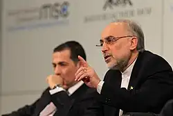 On 13 December 2010, Ahmadinejad dismissed Manouchehr Mottaki for unknown reasons and appointed Salehi in an acting capacity.[14] On 23 January 2011, Ahmadinejad nominated Salehi to become foreign minister. The Iranian Parliament voted for him on 30 January and he became the foreign minister of Iran, gaining 146 positive votes.[15] The European Union and the Treasury of the United Kingdom had put Salehi into the sanction list as an asset freeze target on 18 November 2009 due to his previous involvement in Iran's nuclear programme.[16] The EU waived this designation when he became foreign minister in 2010.[17] His term as foreign minister ended on 15 August 2013 when Mohammad Javad Zarif took the position in the elected President Hassan Rouhani's government.[18] A day after, Rouhani appointed Salehi as head of Atomic Energy Organization for a second time on 16 August 2013.[8][18] Salehi replaced Fereydoon Abbasi in the post.[19]