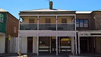 Allison's Pharmacy is a nineteenth-century commercial building. It was acquired by pharmacist and dentist Joseph W. Allison from a Mr. Hawkins in 1890. Allison renovated the property to include facilities for his dental operations. His son succeeded him in the business, which operated out of the building until at least 1940, but had ceased operation some time before J. W. Allison's death in 1945.[2][3][4] Advertising signage from the Allison business remains partially visible, though now obscured by the adjoining arcade.[5][6]