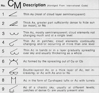 - Species: Altocumulus has four species. The stratiformis species (Ac str) is composed of sheets or relatively flat patches of stratocumuliform cloud. The synoptic coding is determined by the predominant variety or occasionally by the genitus mother cloud. Altocumulus lenticularis (Ac len lenticular cloud) is a lens-shaped middle cloud which can resemble flying saucers and may occasionally be mistaken for "unidentified flying objects". This is formed by uplift usually associated with mountains. but usually with at least some grey shading. It is coded CM4 on the SYNOP weather observation. Grey shading is also seen with altocumulus castellanus (Ac cas), a turreted middle cloud that can achieve significant vertical development and signals increasing air mass instability. It is nevertheless usually classified as middle rather than vertical and is coded CM8. The floccus species (Ac flo) is a tufted middle cloud which is also associated with greater instability. It shares the same code CM8. Chaotic altocumulus, which is typically poorly defined with multiple species or transitional forms arranged in several layers,[5] is coded CM9.