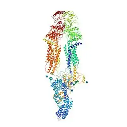 The human gamma-secretase protein complex imaged using cryo-electron microscopy. The structure contains nicastrin (red), presenilin-1 (orange), PEN-2 (blue), and APH-1 (green). This is a transmembrane protein complex that processes amyloid precursor protein (APP) to Aβ peptide.