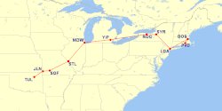 Flight 327 was a regularly scheduled flight between T. F. Green Airport near Providence, Rhode Island and Tulsa Municipal Airport with intermediate stops at Logan Airport in Boston; LaGuardia Airport in New York City; Hancock Airport in Syracuse, New York; Rochester Municipal Airport in Rochester, New York; Willow Run Airport near Detroit; Midway Airport in Chicago; Lambert Municipal Airport near St. Louis; Springfield Municipal Airport in Springfield, Missouri; and Joplin Municipal Airport near Joplin, Missouri.[1][2] It was operated by American Airlines using one of the company's 40-passenger Convair CV-240 twin radial engine aircraft.[3]: 9 The airline operated this type of aircraft on its short-haul routes between 1948 and 1964.[4][5]