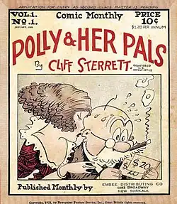 In 1933, salesperson Maxwell Gaines, sales manager Harry I. Wildenberg, and owner George Janosik of the Waterbury, Connecticut, company Eastern Color Printing—which printed, among other things, Sunday-paper comic-strip sections – produced Funnies on Parade as a way to keep their presses running.[16] Like The Funnies, but only eight pages,[17] this appeared as a newsprint magazine. Rather than using original material, however, it reprinted in color several comic strips licensed from the McNaught Syndicate, the Ledger Syndicate, and the Bell-McClure Syndicate.[18] These included such popular strips as cartoonist Al Smith's Mutt and Jeff, Ham Fisher's Joe Palooka, and Percy Crosby's Skippy. Eastern Color neither sold this periodical nor made it available on newsstands, but rather sent it out free as a promotional item to consumers who mailed in coupons clipped from Procter & Gamble soap and toiletries products. The company printed 10,000 copies.[17] The promotion proved a success, and Eastern Color that year produced similar periodicals for Canada Dry soft drinks, Kinney Shoes, Wheatena cereal and others, with print runs of from 100,000 to 250,000.[15][19]
