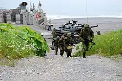 The Amphibious Rapid Deployment Brigade (水陸機動団, Suirikukidōdan)[5] is the only marines brigade units of the Japan Ground Self-Defense Force (JGSDF) responsible for conducting amphibious warfare, coastal defence, and rapid response operations to security threats in island areas in Japanese territorial waters if invaded.