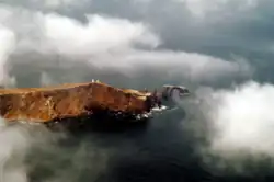 Along with Santa Barbara Island, Anacapa was formed by volcanic eruptions between 19 and 15 million years ago.[8][1] These eruptions are believed to have been caused by thinning of ocean crust as the block containing the northern Channel Islands and Santa Monica Mountains was rotated clockwise by the transverse motion of the Pacific and North American plates.[8] Lava from these eruptions can be found across the region, and in depths of up to 10,000 feet (3,000 m).[8] The rocks that make up Anacapa are composed of lava, breccias, volcanic ash, and cinders.[1]