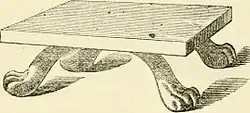 In ancient Assyria plaques would be used as furniture. The ancient Assyrians had carved ivory pieces. They were used to make fan handles, boxes, and furniture inlays. The furniture would commonly depict flowers.[31] There was a wide variety of Assyrian chairs. Some chairs had backs and arms, some resembled a footstool. Sometimes Assyrian chairs would be placed so high a footstool was required to sit on them. Chairs and footstool would be furnished with cushions covered in tapestries. Wealthier Assyrians would also furnish their couches and bed frames with tapestries. Poorer Assyrians would have a single mattress instead of a bed. Assyrian tables had four legs, often these legs would be inlaid with ivory. Other metals could be inlaid into chairs and sofas. Households would also have bronze tripods for the purpose of holding vases of wine and water. Some vases were made of terracota, these vases could also be glazed with a blue vitrified substance resembling vases used by the Egyptians.[32] The tripods used to hold these vases had feet shaped to resemble oxen or clinched hands.[33]