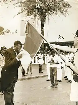 While Mbida was in Paris, Jean Ramadier donated 200,000 CFA francs to any Cameroonian deputy who is ganging up on Mbida.[7] He instigated a vote of no confidence against the Mbida's government and wrote the speech of Ahmadou Ahidjo.[7][21] When Mbida returned to Cameroon, he addressed by telegram his resignation to the President of the French Republic, René Coty, at Prime Minister, Félix Gaillard and at Minister of Overseas France, Gérard Jaquet. In his telegram, he wrote: "I decided not lend nor subject myself to these illegal manoeuvrings, and I present today my resignation at the High Commissioner as Prime Minister, Head of the Cameroonian government" (French: " J'ai donc décidé de ne pas me prêter ni soumettre plus longtemps à ces manœuvres illégales et je remets ce jour au haut commissaire ma démission de Premier ministre, Chef du gouvernement camerounais").[22] He succeeded in having Ramadier transferred to another post. He replaced by Ahmadou Ahidjo who became Cameroon's first président on, 5 May 1960. Ahidjo who was at the beginning his friend, wanted to integrate Mbida in his first government but Mbida disagreed with Ahidjo's extremely pro-French politics and he refused and went into exile in Conakry.