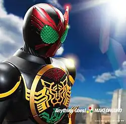 "Anything Goes!" is a song by Japanese recording artist Maki Ohguro, her 32nd single in her over twenty-year-long career. The song serves as the opening theme of the 2010-2011 Kamen Rider Series Kamen Rider OOO.[1][2] The single for the song was released on November 17, 2010, as a standard CD release and a CD+DVD release featuring the music video for the song.[3] On September 15, 2010, Avex released the opening sequence edit of the song to digital music outlets.[4] The single includes 3 variations of the song: the single cut, a ska edit, and the instrumental track. Japan-based rapper Rah-D is featured on the track.[5] "Anything Goes!" is Maki Ohguro's first single in 11 years to break the top 10 of the Oricon at number 7, after selling 33,000 copies in its first week of release.[6]