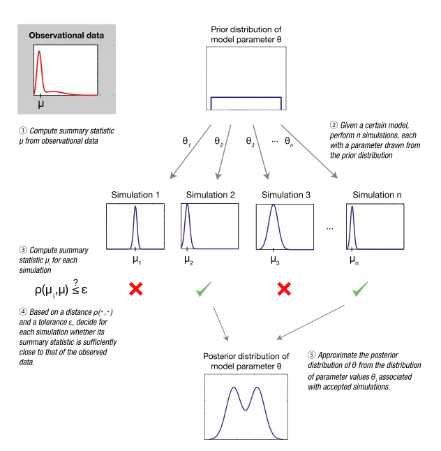 - ^ a b c d e f g h Csilléry, K; Blum, MGB; Gaggiotti, OE; François, O (2010). "Approximate Bayesian Computation (ABC) in practice". Trends in Ecology & Evolution. 25 (7): 410–418. Bibcode:2010TEcoE..25..410C. doi:10.1016/j.tree.2010.04.001. PMID 20488578. S2CID 13957079.