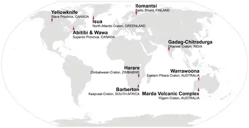 | Onverwacht Group[35] | 3445 ± 3[35] | Barberton | Kaapvaal Craton | South Africa |