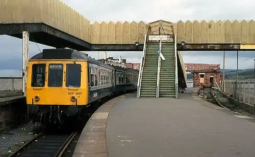 The station had a single island platform. With the closure of Montgomerie Pier station on 6 May 1968,[1] Winton Pier station became the sole passenger rail terminus at the harbour. When sectorisation was introduced in the 1980s, the station was briefly served by ScotRail before closing, replaced by Ardrossan Harbour railway station (situated slightly further inland) on 19 January 1987 upon the commencement of electric services.[1] Train services in connection with the sailings of Burns and Laird Lines to Belfast and Isle of Man Steam Packet Company to Douglas, Isle of Man ceased in 1976 and 1985, respectively, when the shipping routes closed.