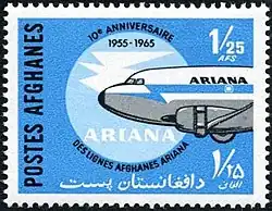 Postage stamp of Afghanistan from 1965 commemorating the 10th anniversary of Ariana. The logo features an Afghan swallow bird and a blue field representing precious lapis lazuli stones; it was personally designed by the then King of Afghanistan, Zahir Shah.[8]