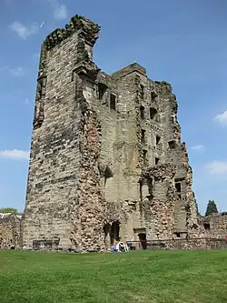 The ruins of Ashby de la Zouch Castle are located close to the centre of the modern town, and comprise two large towers and associated buildings arranged around a court, with formal gardens to the south. Lord Hastings probably intended his castle to ultimately have four large towers, enclosing the interior buildings with a curtain wall to a regular design, but only half of these towers were completed by the time of his death.[49] The outer court that lay to the north of the surviving complex has been lost; having been converted into first Ashby Place, and then Ashby Manor, it is now occupied by the Manor House Preparatory School.[50] The historian John Goodall considers Ashby de la Zouch to form an "outstanding example of a late medieval castle".[51]
