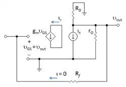 where the approximation is accurate in the common case where rO >> RD. With this relationship it is clear that the limits T → 0, or ∞ are realized if we let transconductance gm → 0, or ∞.[5]