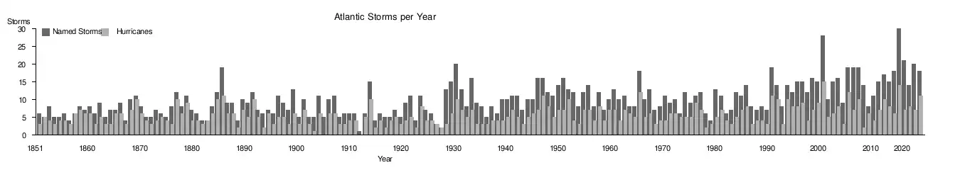 Atlantic tropical and subtropical cyclones that reach tropical storm intensity are named from a predetermined list. On average, 14 named storms occur each season, with an average of 7 becoming hurricanes and 3 becoming major hurricanes, Category 3 or higher on the Saffir–Simpson scale. The most active season on record was 2020, during which 30 named tropical cyclones formed. Despite this, the 2005 season had more hurricanes, developing a record of 15 such storms. The least active season was 1914, with only one known tropical cyclone developing during that year.[5]