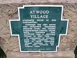 Atwood Village was abandoned and then flooded in the 1930s for the construction of the dam and the resulting formation of Atwood lake. When water levels are low, foundation stones from former buildings in Atwood Village can be seen, along with evidence of a former rail station and roadbed near Dellroy.[7]