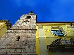 The bell-tower with the clock and part of the facade.
