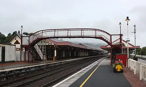 Aviemore railway station serves the town and tourist resort of Aviemore in the Highlands of Scotland. The station, which is owned by Network Rail (NR) and managed by ScotRail, is on the Highland Main Line, 83 miles 31 chains (134.2 kilometres) from Perth, between Kingussie and Carrbridge, and is also the southern terminus of the Strathspey preserved railway.[5]