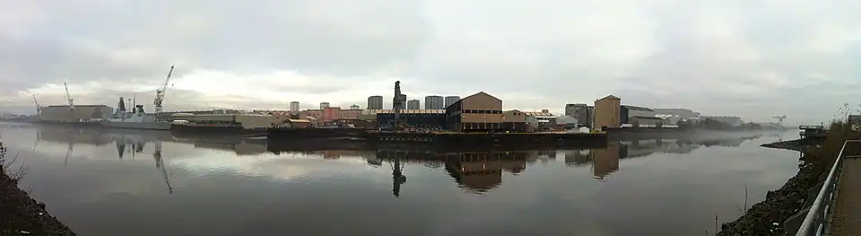 Panoramic view of BAE Systems Scotstoun in December 2010, with HMS Dragon on the left preparing for sea trials.