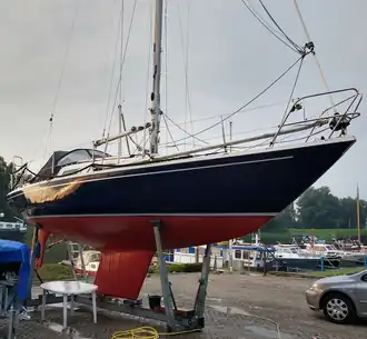 The Ballad 30 is a recreational keelboat, built predominantly of fibreglass, with wood trim. The hull is made from single skin polyester fibreglass, while the deck is a fibreglass-Divinicell sandwich. It has a masthead sloop rig with aluminum spars, a keel-stepped mast, wire standing rigging and a single set of unswept spreaders. The hull has a raked stem; a raised counter, reverse transom; a skeg-mounted rudder controlled by a tiller with an extension and a fixed fin keel. It displaces 7,276 lb (3,300 kg) and carries 3,417 lb (1,550 kg) of lead ballast.[1][2]